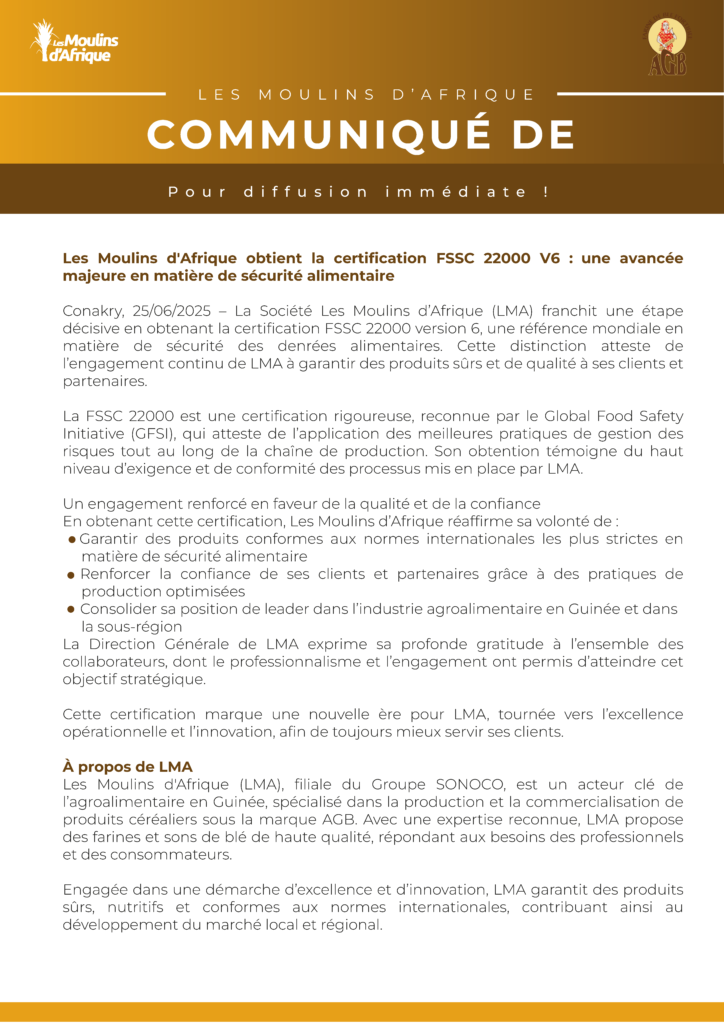 Les Moulins d’Afrique obtient la certification FSSC 22000 V6