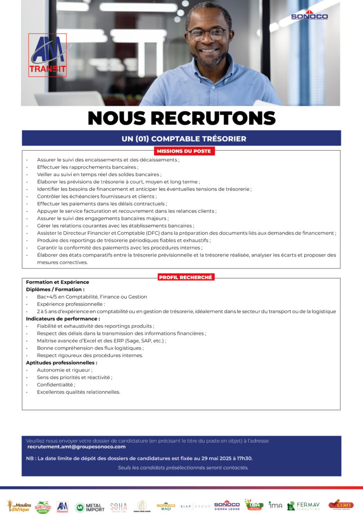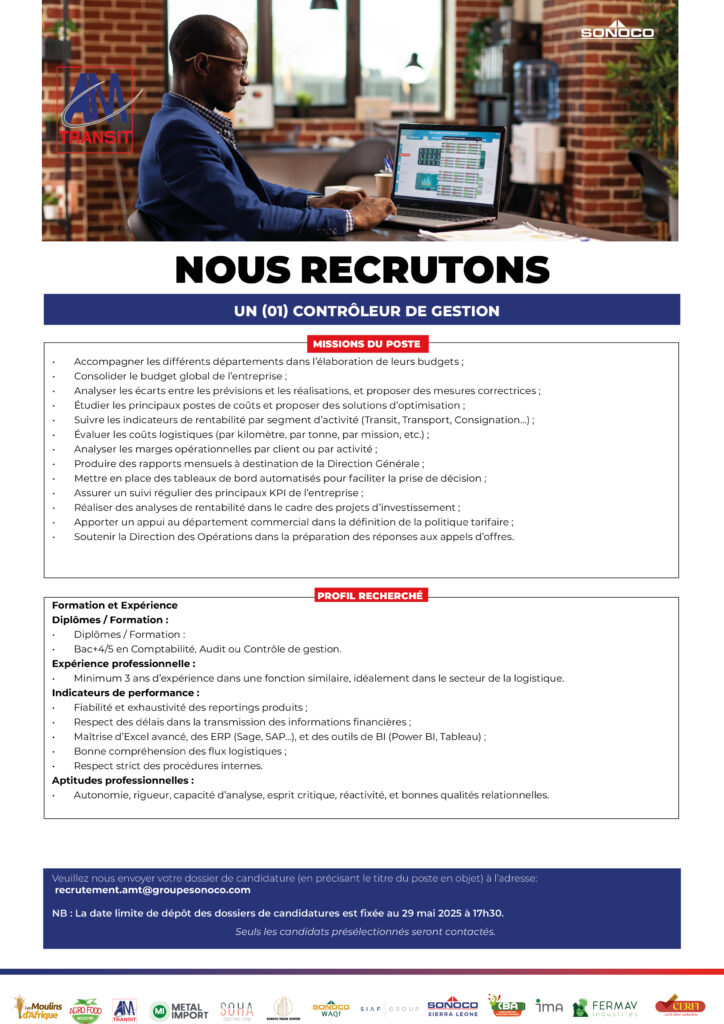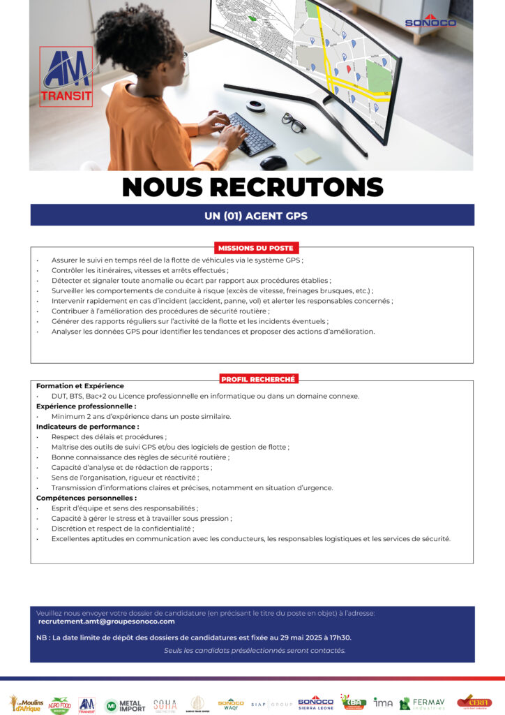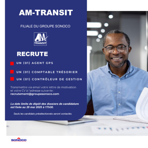 SONOCO > Actualités_ > Offre d'emploi > UN (01) AGENT GPS; UN (01) COMPTABLE TRÉSORIER; UN (01) CONTRÔLEUR DE GESTION
